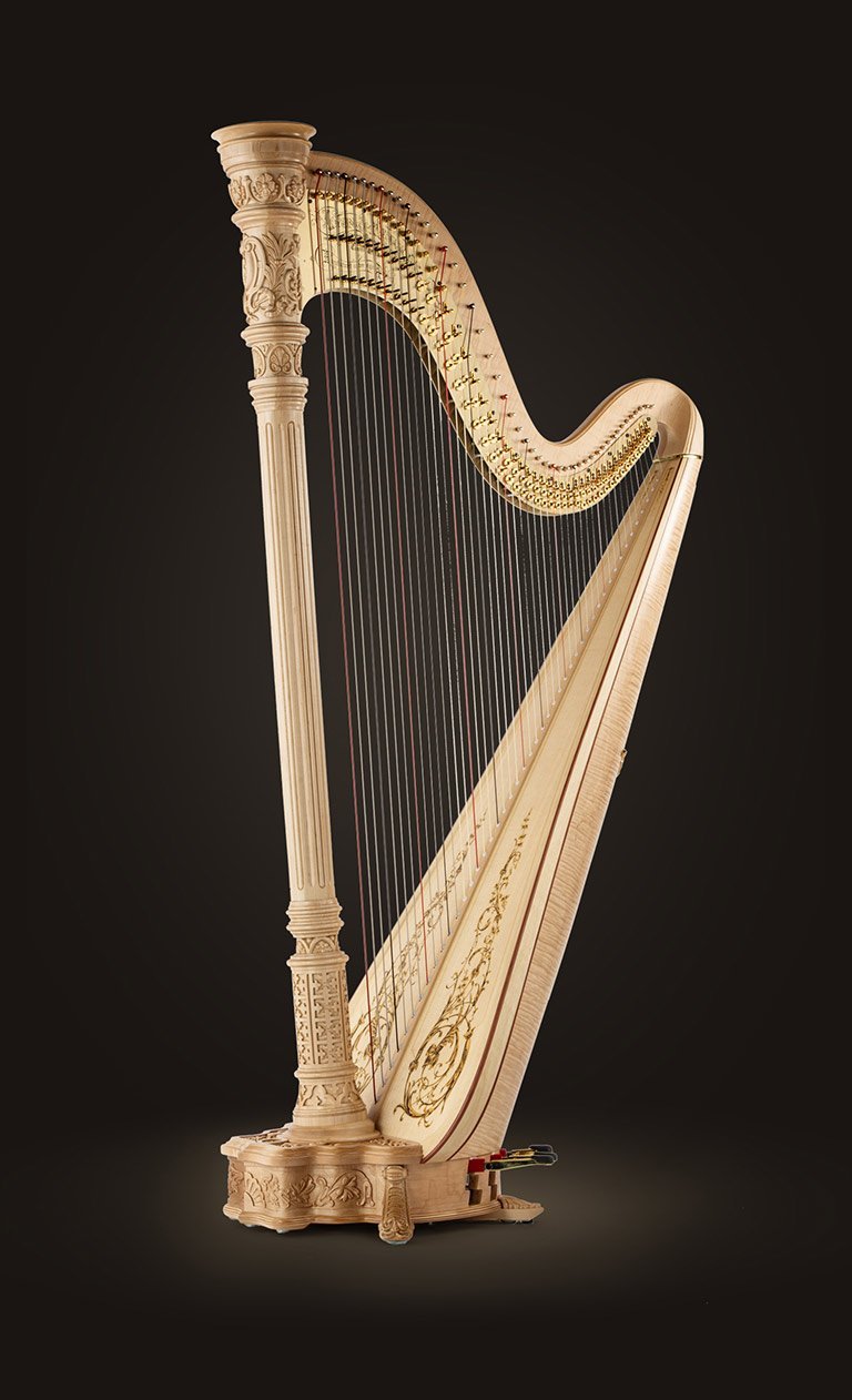 Created by Lyon & Healy in 1890, this complex harp is symbolic of the Victorian era during which it was first made. The Style 23 has become the most recognized harp in the world and showcases the woodworking artistry of the Lyon & Healy craftspeople. The highly embellished floral carving at the crown, top of the column, base and feet, is coupled with a fleur de lis pattern at the bottom of the column – both were notable features of the time. Sweeping organic decoration accents the extended Sitka Spruce soundboard, which also features a double Rosewood inlay along the edges.