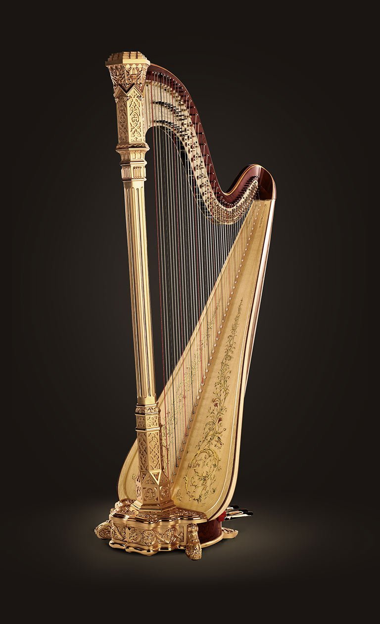 Introduced in 1911, the Style 3 is a modern version of the Gothic design found in Western Europe dating back to the twelfth century. Hand-gilded with 23+ karat gold leaf, the dramatic geometrical patterns and bold details featured on the column and base bring to mind the pointed arches, buttresses and vaulting popular in the Gothic style. The hand-painted soundboard decoration features an elaborate, swirling floral vine intensified with subtle green and red hues.