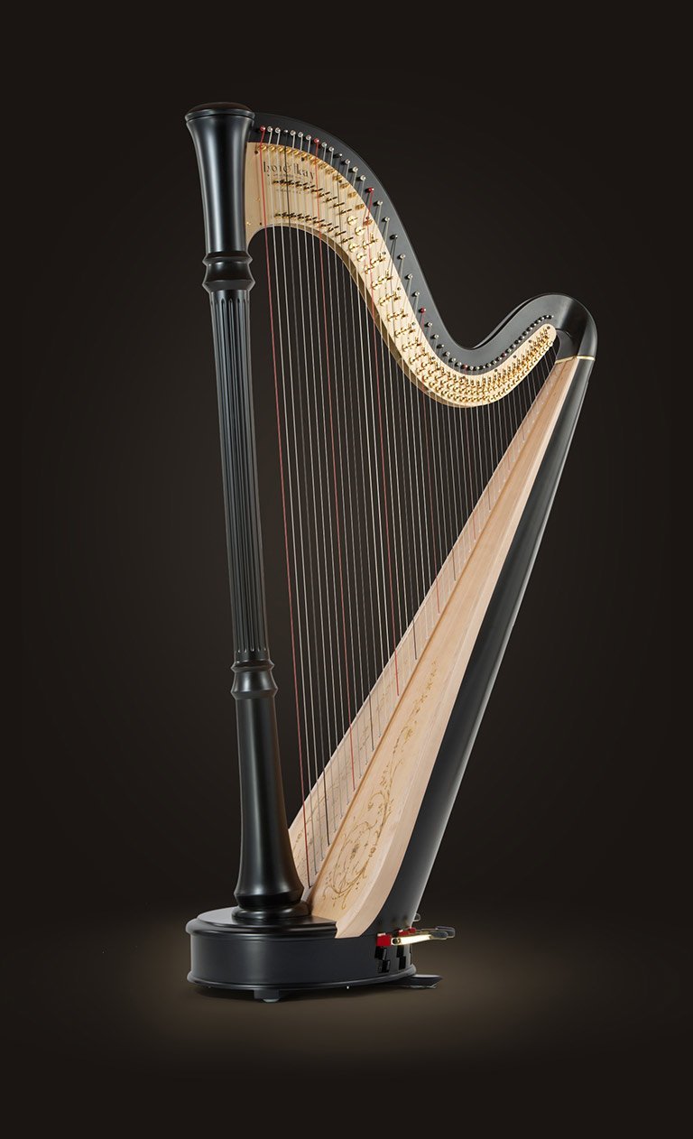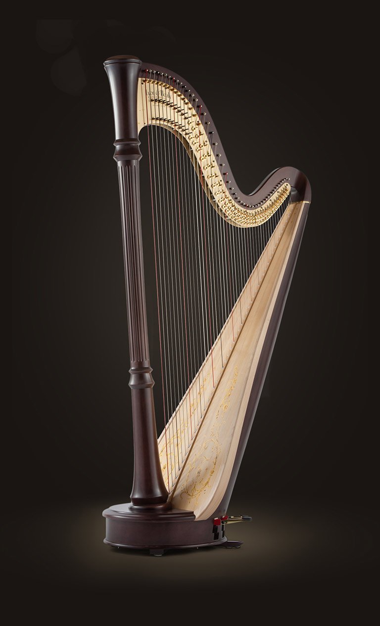 A contemporary harp designed by Lyon & Healy in 1985, the Style 85 is marked by its pure elegance. Subtle in design, the Style 85’s ornamentation is sparse, bringing focus to its fluted column, the fluid curves in the base and showcasing the classic harmonic outline of the harp. The soundboard is decorated with a beautiful climbing vine while the solid brass action plates feature restrained decoration.